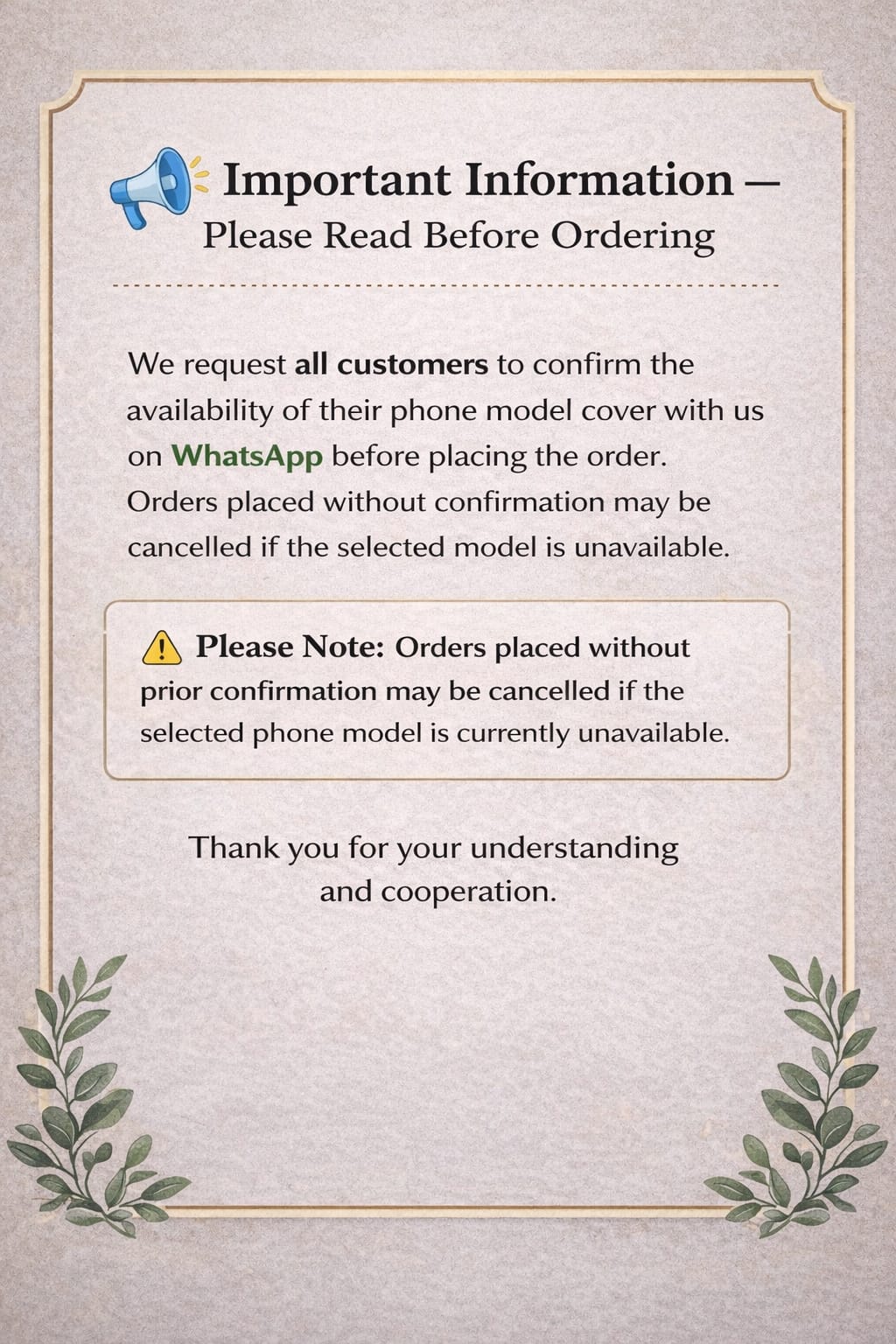 ⚠️We request all customers to confirm the availability of their phone model cover with us on WhatsApp before placing the order. Orders placed without confirmation may be cancelled if the selected model is unavailable.